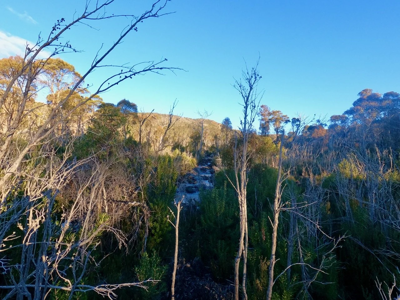 We didn’t end up leaving Lake Myrtle, after packing up camp, until 11:20am. We set off, retracing our steps towards the car, taking about 1½ hours to a spot on the Lake Myrtle Track where we decided to go off track to summit Nescient Peak. Unfortunately, on the way in, we’d completely missed an obviously cairned point where we should have departed the track. Not having seen that, and not having come back quite that far, we assumed the route was completely untracked.