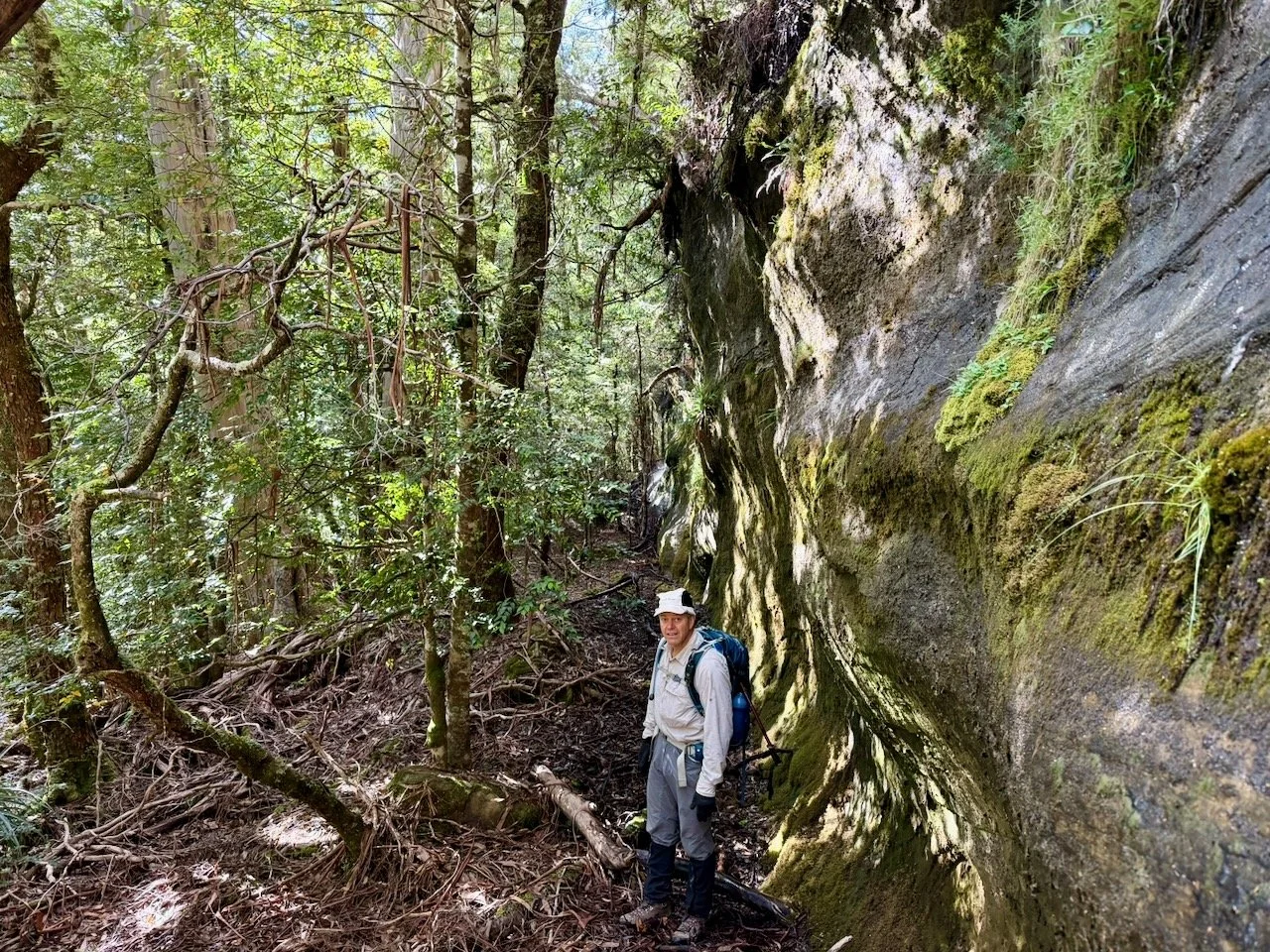 After this, the route continues steeply with several further small climbs, until another cliff is reached about a kilometre further on (at about -42.035940, 146.122320). This is were we made a mistake on our first attempt.