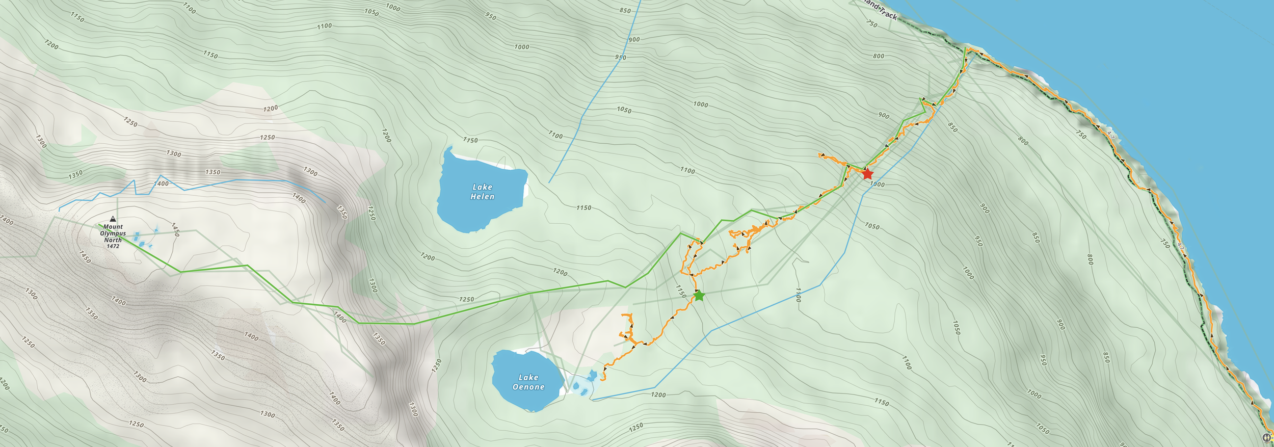 There is a decent area to camp on reaching Lake Oenone, which itself is quite large, and gives a great view ahead to Olympus's northern summit.