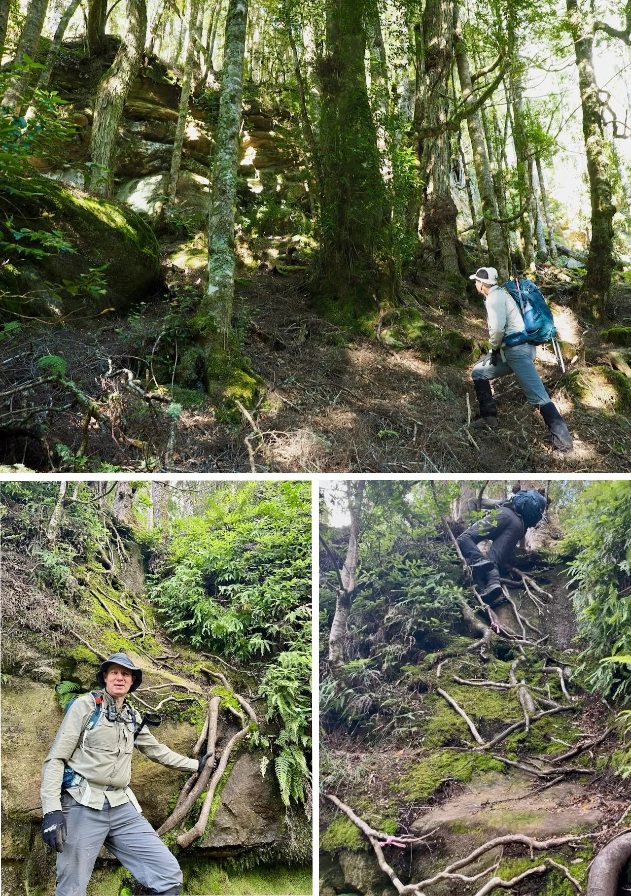 The map below shows where we went wrong. The lighter green lines are Gaia's public tracks, the darker green line is the route I thought we should take based on these public tracks, and the orange is the route we did take up. Where we made our mistake was at the red star. Here, instead of going to the right along the base of the cliff, we should have gone straight up, staying closer to the stream. The climb here is non obvious – although there is the appearance of a pad up the side of a waterfall, but the rock is so sheer and slippery that it looks foolish to try. But at the top of this, there is a clear pad that takes you forward and up to the mid plateau. On our successful attempt, we ended up climbing around a corner just to the right of this. The green star shows where we got back on track.